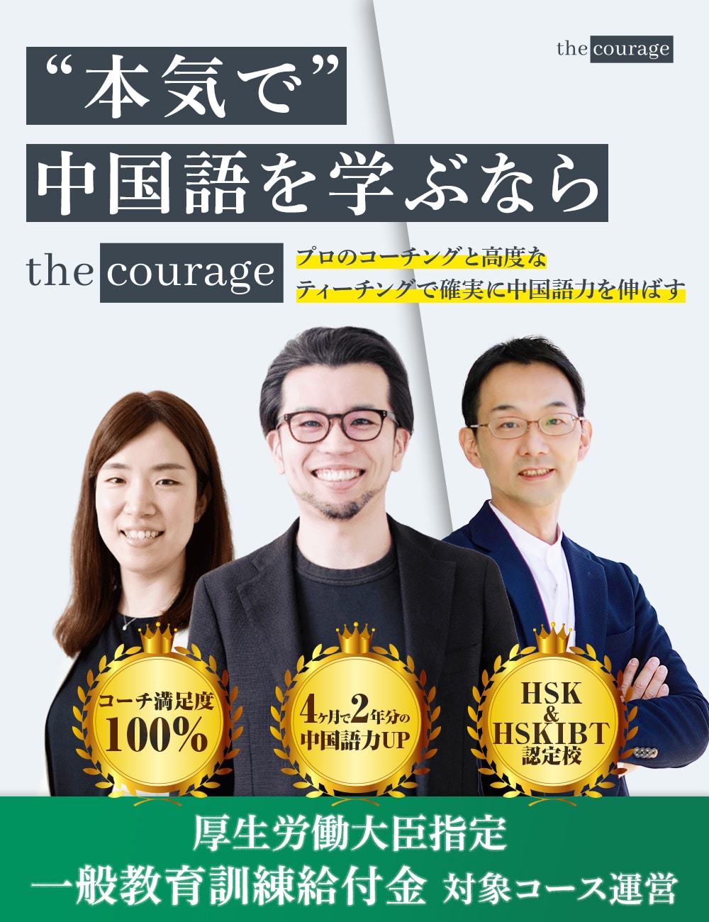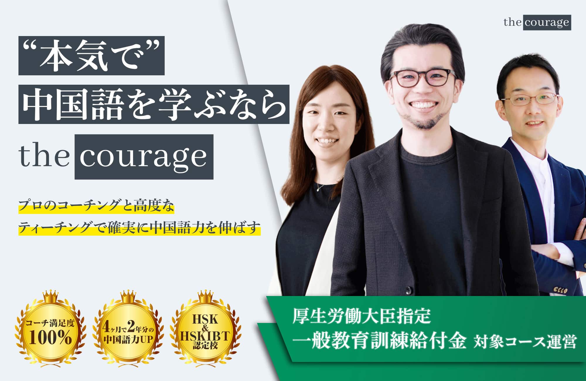 中国語&英語で1,000名以上の指導実績を持つコーチが、データに基づく信頼できるカリキュラムを提供しています。また、カリキュラムは常に改善され続けています。the courageでは広告にかける費用を極限まで抑え、そうしたコストも研究開発費に充てております。